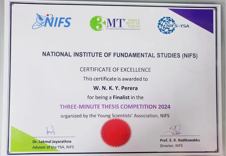 The Finals of the Three Minute Thesis (3MT) Competition 2024 organized by the Young Scientists Association (YSA) of the National Institute of Fundamental Studies (NIFS) Kandy was held on 9th of July 2024 at the Cyril Ponnamperuma Auditorium of the NIFS. Three Minute Thesis (3MT) is a research communication competition developed by the University of Queensland. The preliminary round was held on 13th June 2024 and from 50+ competitors, 10 were selected for the finals. Ms. Nethmi Perera undergraduate of Biotechnology, Faculty of Science proudly secured a spot as a finalist, being the only non-state university student among the 3- Minute Thesis (3MT) finalists. She was guided by her research supervisor, Ms. Danushika Nayomi, a lecturer at Faculty of Science, Horizon Campus. The competition provided a platform for Sri Lanka's aspiring scientists to develop presentation skills and the ability to communicate research findings effectively to a general audience.